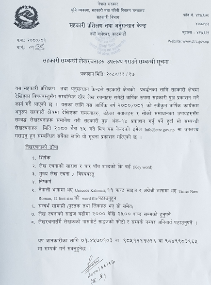 यस आर्थिक वर्ष २०८०/०८१ को स्वीकृत वार्षिक कार्यक्रम अनुरुप सहकारी क्षेत्रमा देखिएका समस्याहरु, उठेका सवालहरु र सोको समाधानका उपायहरुसँग सम्वद्ध लेखरचनाहरू समावेश गरी सहकारी पुञ्ज, अंक-१४ प्रकाशन गर्नु पर्ने हुदाँ सो सम्बन्धी लेखरचनाहरु मिति २०८० चैत्र १५ गते भित्र यस केन्द्रको इमेल Info@ctrc.gov.np मा उपलब्ध गराउनु हुन सम्बन्धित सबैका लागि यो सूचना प्रकाशन गरिएको छ ।