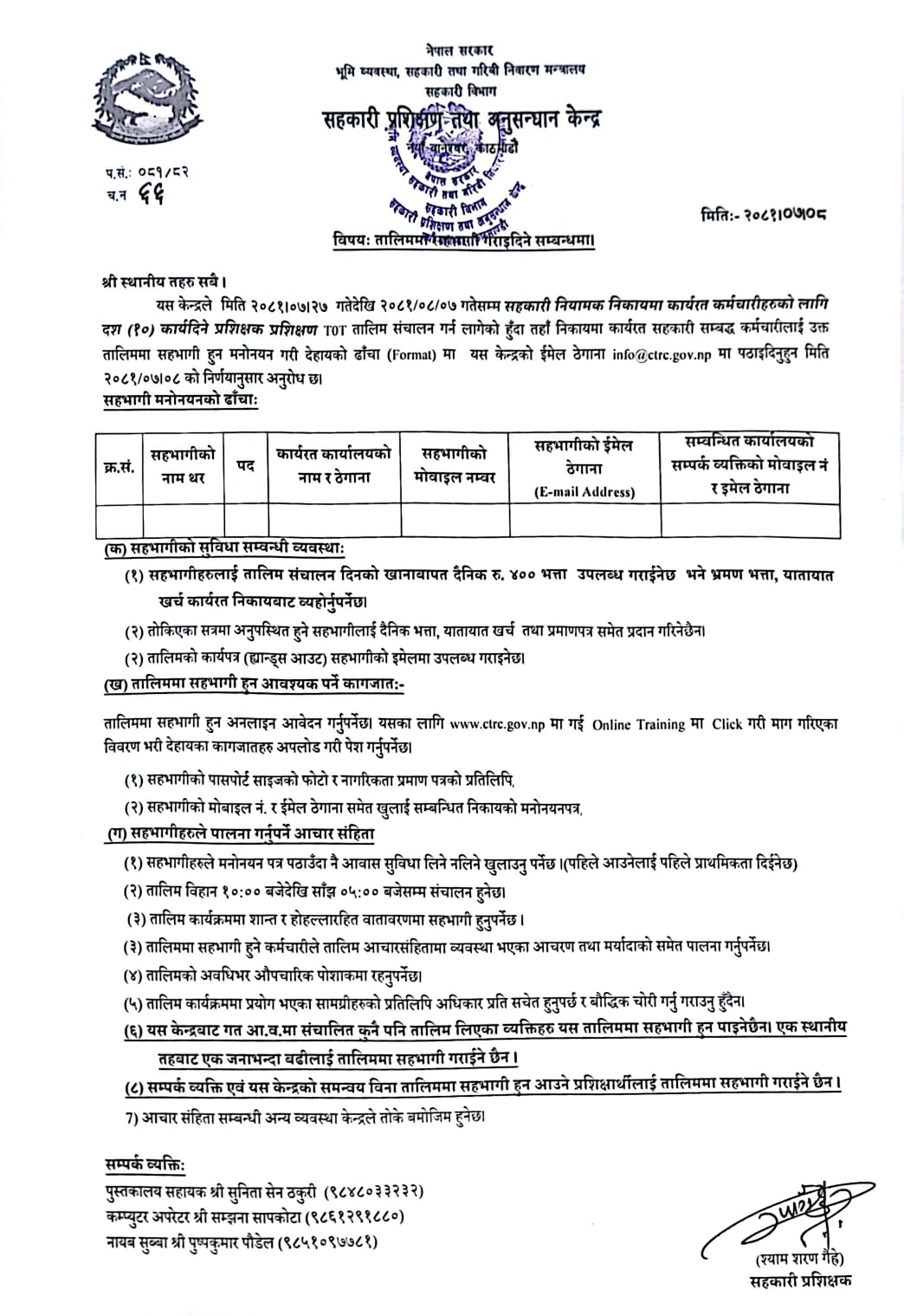 यस केन्द्रले मिति २०८१/०७/२७ गतेदेखि २०८१/०८/०७ गतेसम्म सहकारी नियामक निकायमा कार्यरत कर्मचारीहरुको लागि दश (१०) कार्यदिने प्रशिक्षक प्रशिक्षण TOT तालिम संचालन गर्न लागेको हुँदा स्थानीय निकायमा कार्यरत सहकारी सम्बद्ध कर्मचारीलाई उक्त तालिममा सहभागी हुन मनोनयन गरी सूचनामा उल्लिखित ढाँचा (Format) मा यस केन्द्रको ईमेल ठेगाना info@ctrc.gov.np मा पठाइदिनुहुन मिति २०८१/०७/०८ को निर्णयानुसार अनुरोध छ।