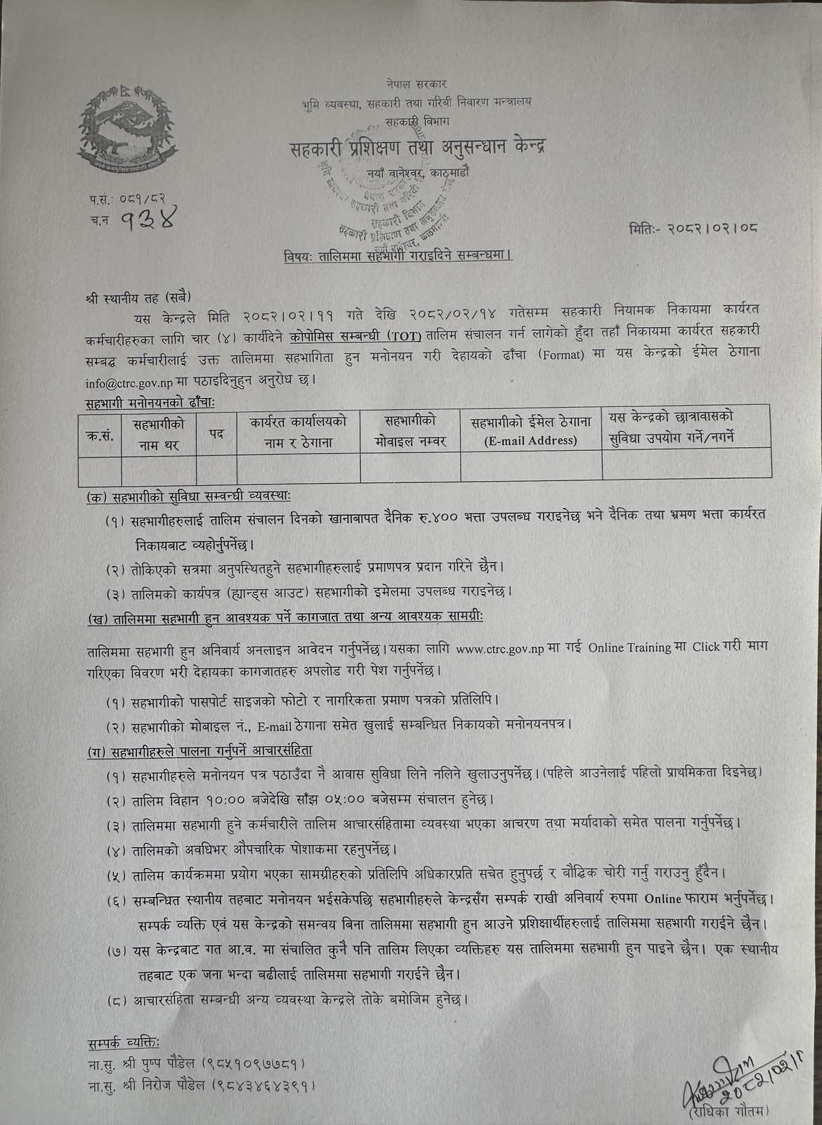 यस केन्द्रले मिति २०८२।०२।११ गते देखि २०८२/०२/१४ गतेसम्म सहकारी नियामक निकायमा कार्यरत कर्मचारीहरुका लागि चार (४) कार्यदिने कोपोमिस सम्बन्धी (TOT) तालिम संचालन गर्न लागेको हुँदा तहाँ निकायमा कार्यरत सहकारी सम्बद्ध कर्मचारीलाई उक्त तालिममा सहभागिता हुन मनोनयन गरी यस केन्द्रको ईमेल ठेगाना info@ctrc.gov.np मा पठाइदिनुहुन अनुरोध छ।