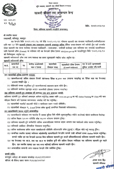 यस केन्द्रले मिति २०८२।०३।१५ गते देखि २०८२/०३/१८ गतेसम्म सहकारी संघ संस्थाका पदाधिकारी/कर्मचारीहरुका लागि चार (४) दिने सहकारी संचालन तथा व्यवस्थापन सम्बन्धी आधारभूत तालिम भौतिक रुपमा संचालन गर्न लागेको हुँदा तहाँ अन्तर्गत रहेका सहकारी संघ संस्था मध्येबाट संस्थाका पदाधिकारी / व्यवस्थापक / कर्मचारी मध्येबाट उक्त तालिममा एक जनालाई सहभागिताका लागि देहायको ढाँचा (Format) मा मनोनयन गरी यस केन्द्रको ईमेल ठेगाना info@ctrc.gov.np मा पठाइदिनुहुन मिति २०८२/०३/१० को निर्णयानुसार अनुरोध छ ।